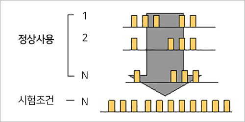 | 시험조건 결정 | 정상사용조건과 고장메카니증이 다르게 되지 않는 범위 내에서 가장 높은 스트레스에서 시험 시험 가능한 시험시간(가속조건) 결정, 가능한 보증수명(가속조건)기간과 동일하게 결정 |