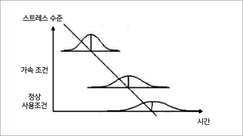2) 스트레스 가속은 시험품의 고장원인과 고장유형을 분석하여 고장 메커니즘을 가속시킬 수 있는 인자 예를 들어 온도, 전압, 온도 사이클을 사용하여 고장을 짧은 시간 내에 발생시킨 후 수명과 스트레스 인자 사이의 통계적 관계식을 이용하여 높은 수준의 스트레스 에서 수명 데이터를 정상 사용 조건으로 환산하여 평가하는 방식이다.